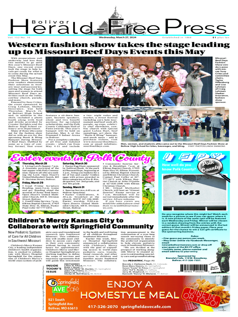 Wednesday, March 27, 2024Vo l. 1 5 2 N o. 1 6$1 plus taxEstablished in 1868Western fashion show takes the stage leading up to Missouri Beef Days Events this May With preparations well underway and