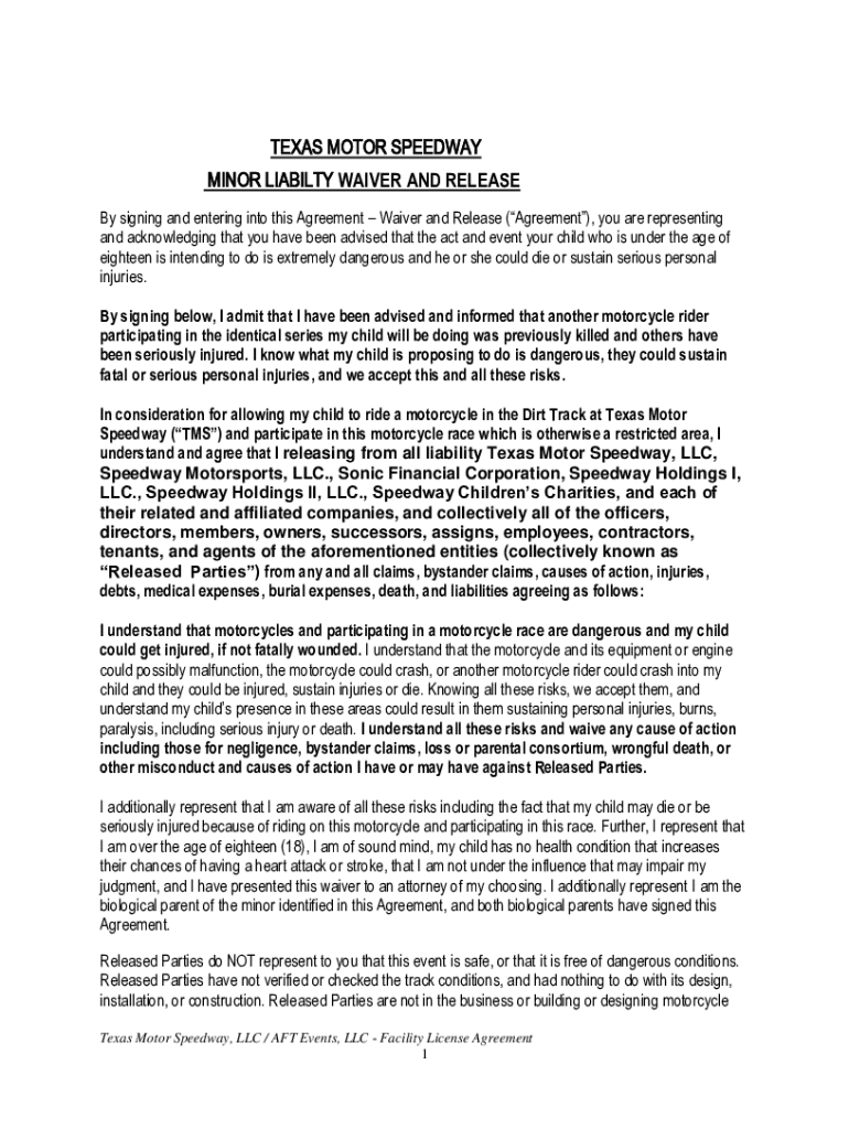 TEXAS MOTOR SPEEDWAY MINOR LIABILITY WAIVER AND RELEASE By signing and entering into this Agreement Waiver and Release (Agreement), you are representing and acknowledging that you have been advised