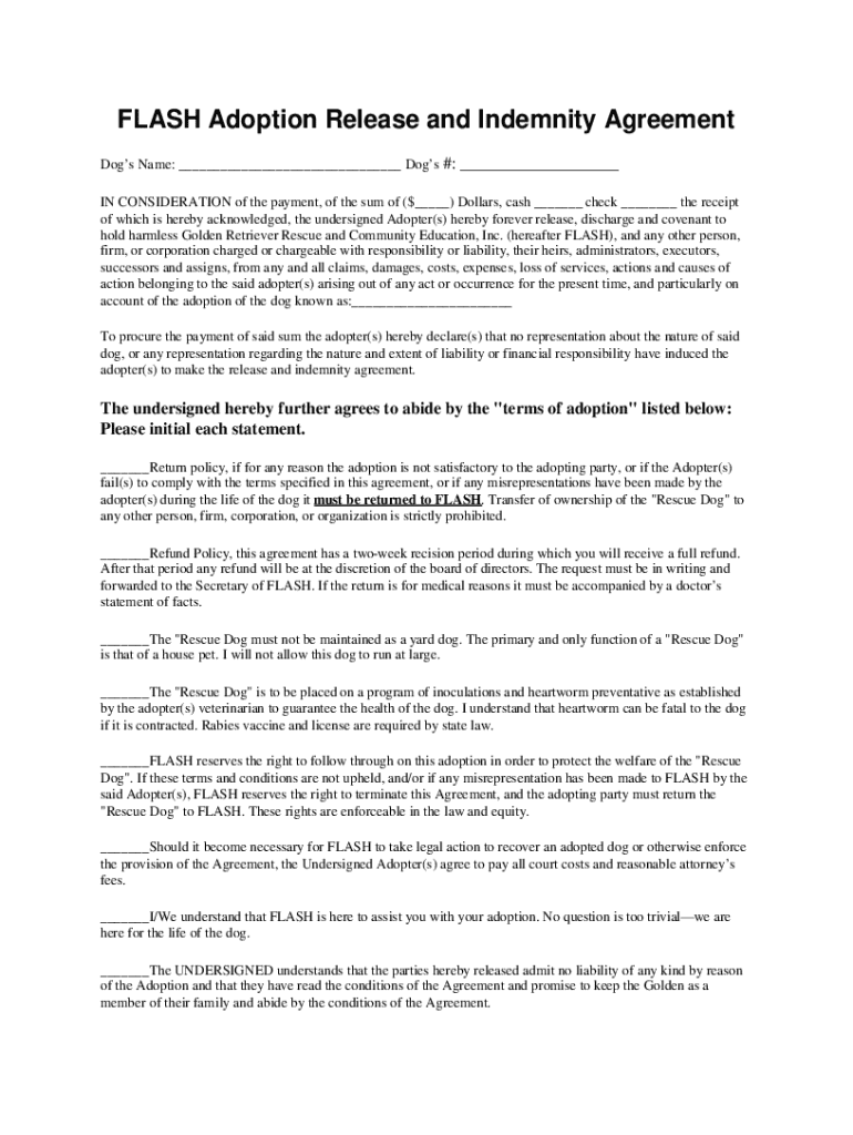 FLASH Adoption Release and Indemnity Agreement Dogs Name: ___ Dogs#: ___IN CONSIDERATION of the payment, of the sum of ($___) Dollars, cash ___ check ___ the receipt of which is hereby acknowledged,