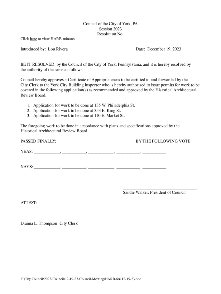 Council of the City of York, PA Session 2023 Resolution No. Click here to view HARD minutesIntroduced by: Lou Riverdale: December 19, 2023BE IT RESOLVED, by the Council of the City of York, Pennsylvania,