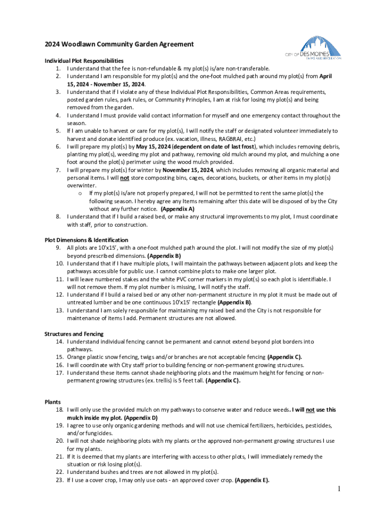 2024 Woodlawn Community Garden Agreement Individual Plot Responsibilities 1. I understand that the fee is nonrefundable & my plot(s) is/are nontransferable. 2. I understand I am responsible for my