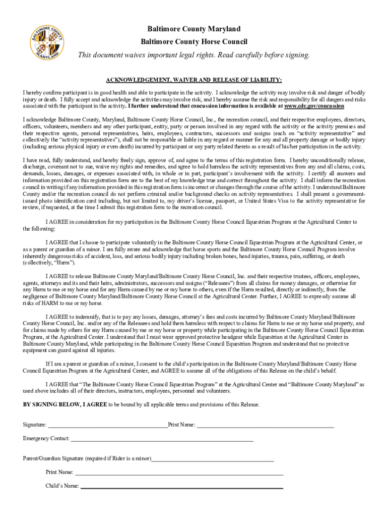 Baltimore County Maryland Baltimore County Horse Council This document waives important legal rights. Read carefully before signing. ACKNOWLEDGEMENT, WAIVER AND RELEASE OF LIABILITY: I hereby confirm