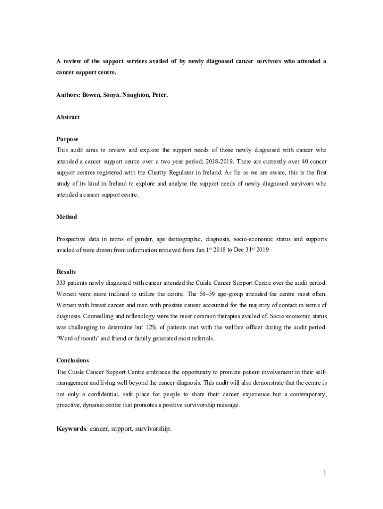 A review of the support services availed of by newly diagnosed cancer survivors who attended a cancer support center. Authors: Bowen, Sonya. Naught on, Peter. Abstract Purpose This audit aims to review