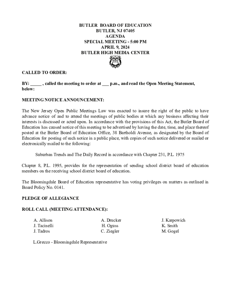 BUTLER BOARD OF EDUCATION BUTLER, NJ 07405 AGENDA SPECIAL MEETING 5:00 PM APRIL 9, 2024 BUTLER HIGH MEDIA CENTERCALLED TO ORDER: BY: ___ , called the meeting to order at ___ p.m., and read the Open