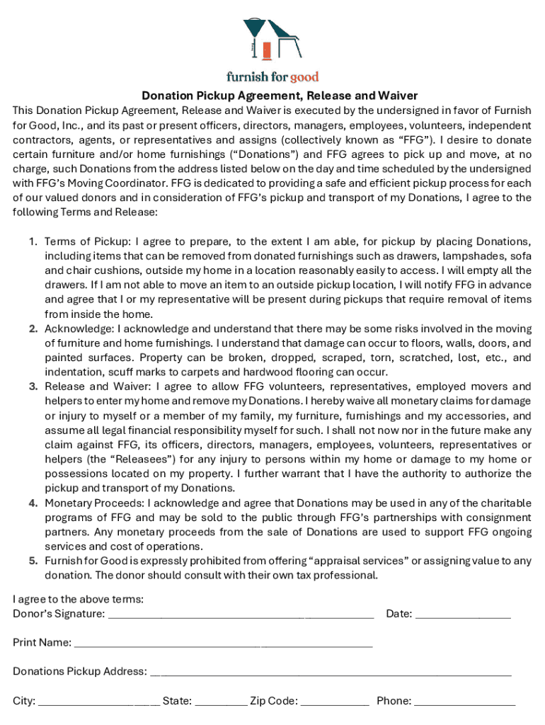Get the free Donation Pickup Agreement, Release and Waiver