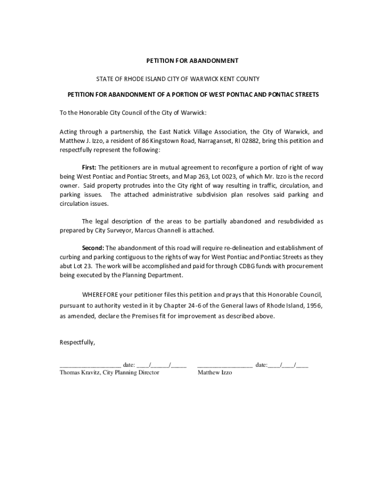 PETITION FOR ABANDONMENT STATE OF RHODE ISLAND CITY OF WARWICK KENT COUNTY PETITION FOR ABANDONMENT OF A PORTION OF WEST PONTIAC AND PONTIAC STREETS To the Honorable City Council of the City of Warwick:
