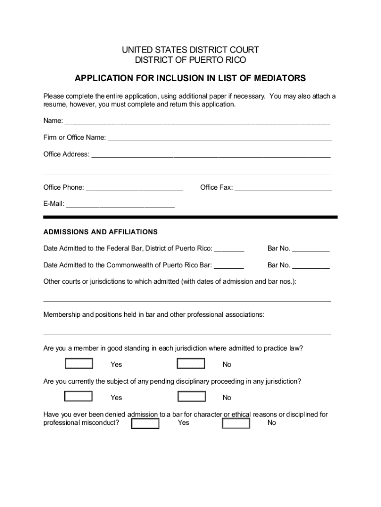 UNITED STATES DISTRICT COURT DISTRICT OF PUERTO RICO APPLICATION FOR INCLUSION IN LIST OF MEDIATORS Please complete the entire application, using additional paper if necessary. You may also attach