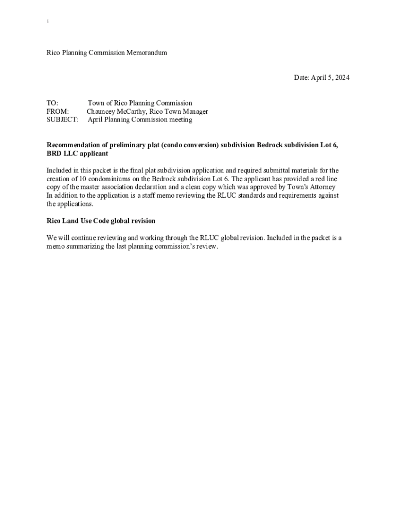 1Rico Planning Commission Memorandum Date: April 5, 2024, TO: FROM: SUBJECT:Town of Rico Planning Commission Chauncey McCarthy, Rico Town Manager April Planning Commission meetingRecommendation of