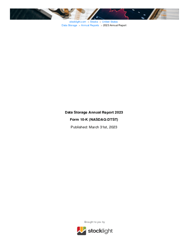 stocklight.com Stocks United States Data Storage Annual Reports 2023 Annual ReportData Storage Annual Report 2023 Form 10K (NASDAQ:DTST) Published: March 31st, 2023Brought to you byData Storage (DTST)