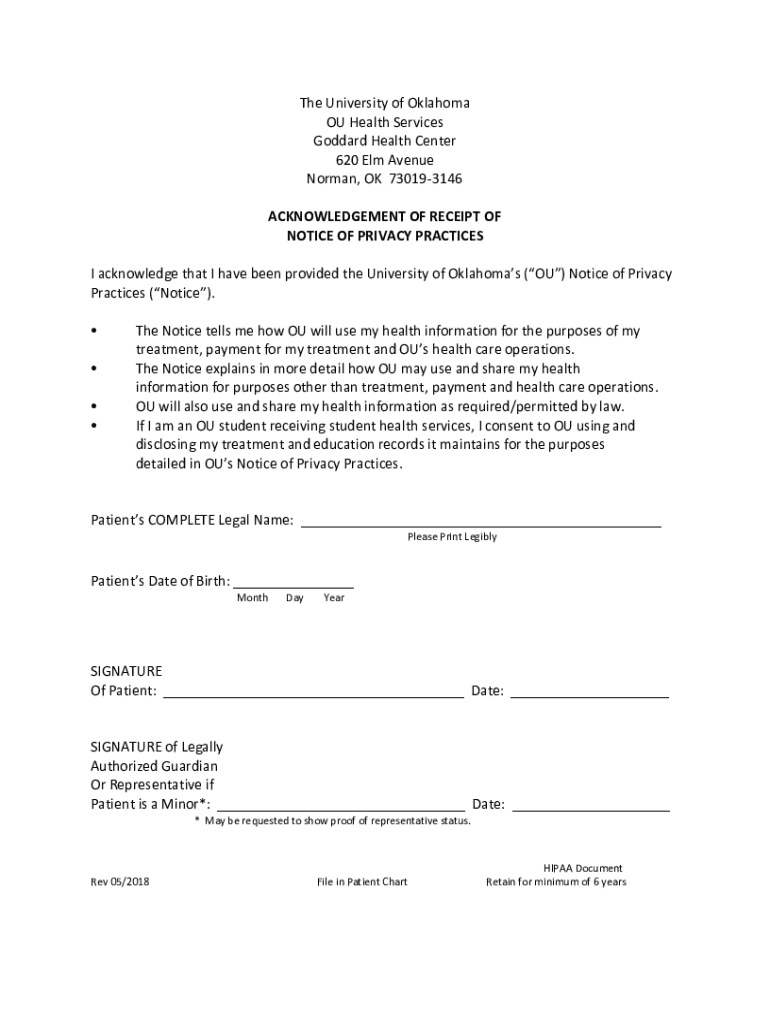 The University of Oklahoma OU Health Services Goddard Health Center 620 Elm Avenue Norman, OK 730193146 ACKNOWLEDGEMENT OF RECEIPT OF NOTICE OF PRIVACY PRACTICES I acknowledge that I have been provided