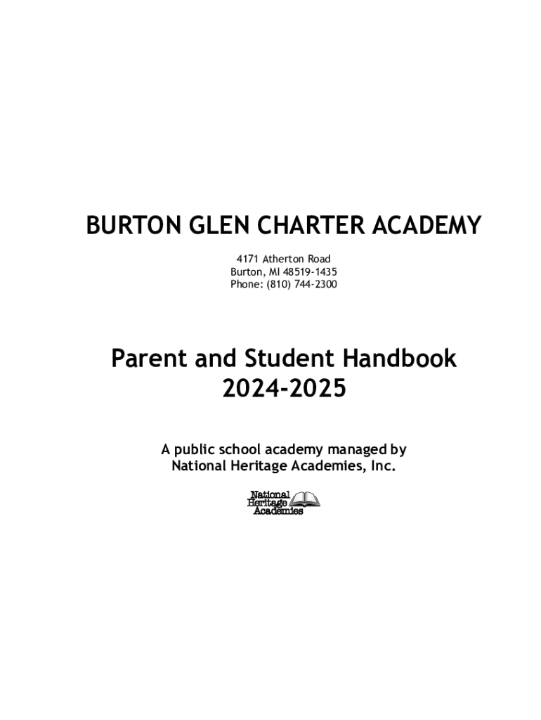 BURTON GLEN CHARTER ACADEMY 4171 Atherton Road Burton, MI 485191435 Phone: (810) 7442300Parent and Student Handbook 20242025 A public school academy managed by National Heritage Academies, Inc. Burton