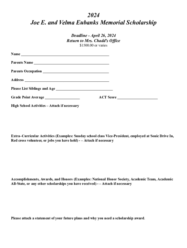 2024 Joe E. and Velma Eubanks Memorial Scholarship Deadline April 26, 2024 Return to Mrs. Chadds Office $1500.00 or varies Name ___ Parents Name ___ Parents Occupation ___ Address ___ Please List