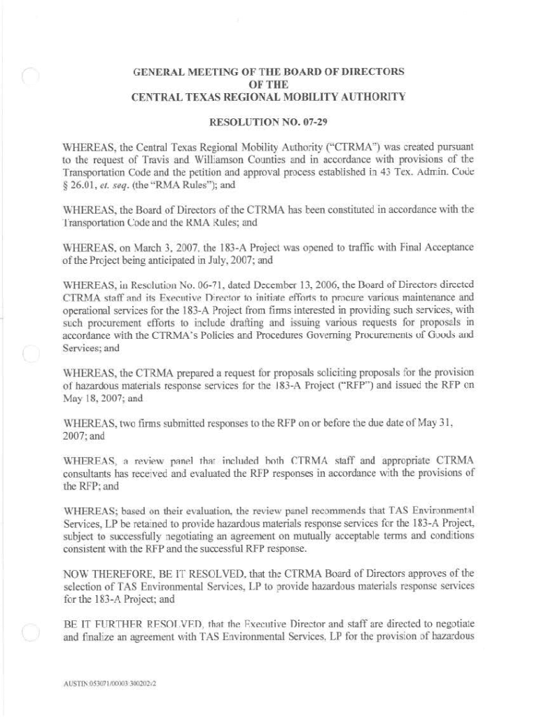 GENERAL MEETING OF THE BOARD OF DffiECTORS OF THE CENTRAL TEXAS REGIONAL MOBILITY AUTHORITY RESOLUTION NO. 0729 WHEREAS, the Central Texas Regional Mobility Authority (\"CTRMA\") was created pursuant