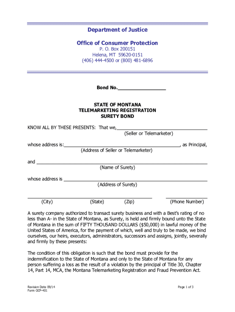 Department of Justice Office of Consumer Protection P. O. Box 200151 Helena, MT 596200151 (406) 4444500 or (800) 4816896Bond No. STATE OF MONTANA TELEMARKETING REGISTRATION SURETY BOND KNOW ALL BY