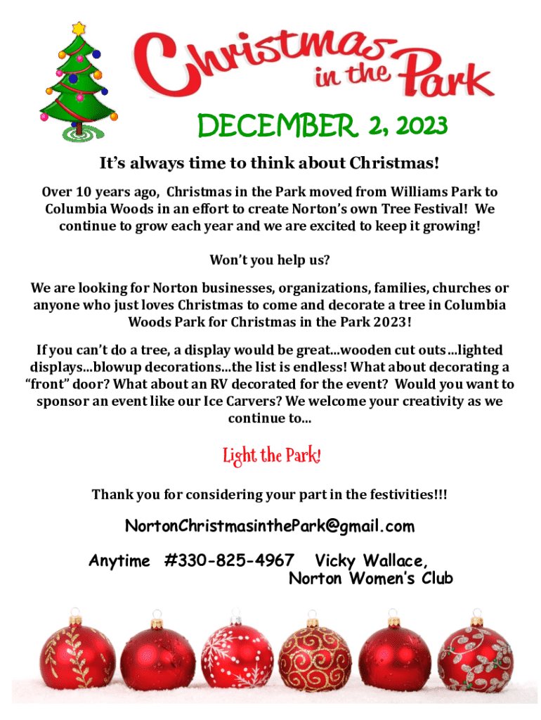 DECEMBER 2, 2023 Its always time to think about Christmas! Over 10 years ago, Christmas in the Park moved from Williams Park to Columbia Woods in an effort to create Nortons own Tree Festival! We