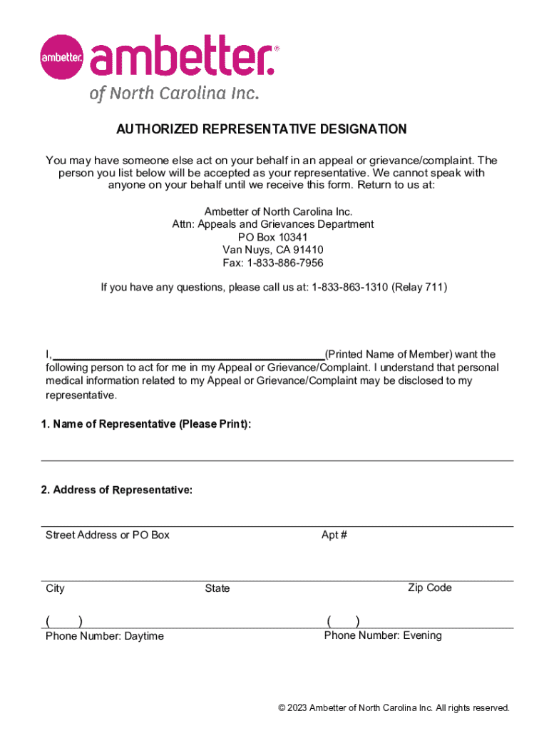 AUTHORIZED REPRESENTATIVE DESIGNATION You may have someone else act on your behalf in an appeal or grievance/complaint. The person you list below will be accepted as your representative. We cannot