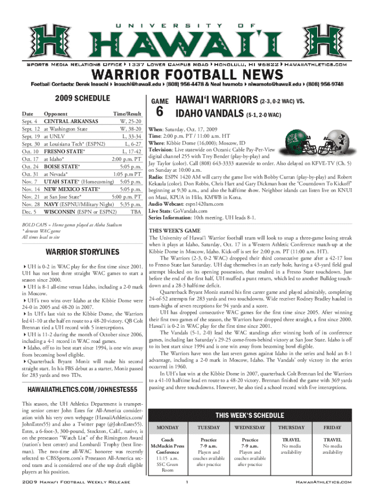 2009 SCHEDULE Date Sept. 4 Sept. 12 Sept. 19 Sept. 30 Oct. 10 Oct. 17 Oct. 24 Oct. 31 Nov. 7 Nov. 14 Nov. 21 Nov. 28 Dec. 5Opponent Time/Result CENTRAL ARKANSAS W, 2520 at Washington State W, 3820