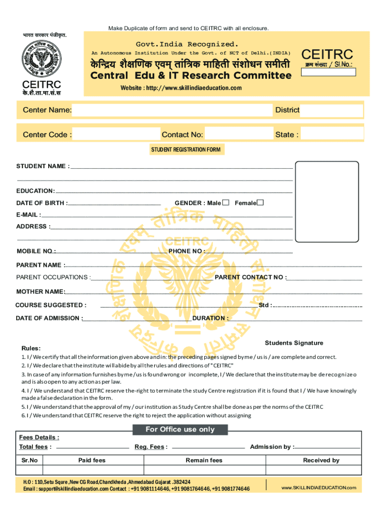Make Duplicate of form and send to CEI TRC with all enclosure. Govt. India Recognized.