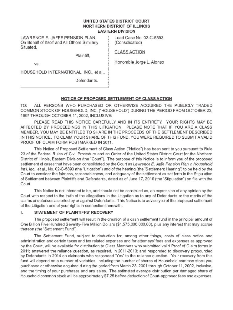 UNITED STATES DISTRICT COURT NORTHERN DISTRICT OF ILLINOIS EASTERN DIVISIONLAWRENCE E. JAFFE PENSION PLAN, On Behalf of Itself and All Others Similarly Situated,) ) ) ) Plaintiff, ) ) vs. ) HOUSEHOLD