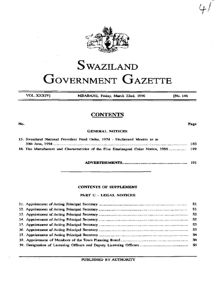 SWAZILAND GOVERNMENT GAZETTE VOL. XXXIV]MBABANE,Friday, March 22nd, 1996[No. 146CONTENTS No.PageGENERAL NOTICES 15. Swaziland National Provident Fund Order, 1974 Unclaimed Monies as at 30th June,