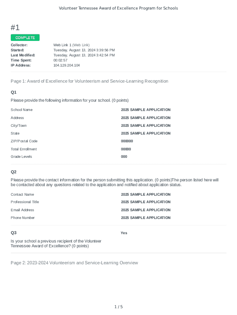 Volunteer Tennessee Award of Excellence Program for Schools#1 COMPLETE Collector: Started: Last Modified: Time Spent: IP Address:Web Link 1 (Web Link) Tuesday, August 13, 2024 3:39:56 PM Tuesday,