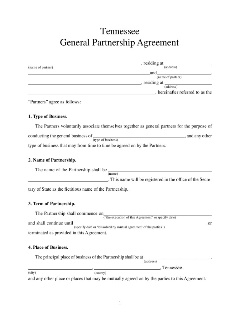 Sample General Partnership AgreementTennessee General Partnership Agreement ___, residing at ___ (address)(name of partner)___and___. (name of partner)___, residing at ___ (address)___, hereinafter