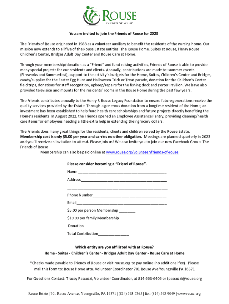 You are invited to join the Friends of Rouse for 2023 The Friends of Rouse originated in 1988 as a volunteer auxiliary to benefit the residents of the nursing home. Our mission now extends to all