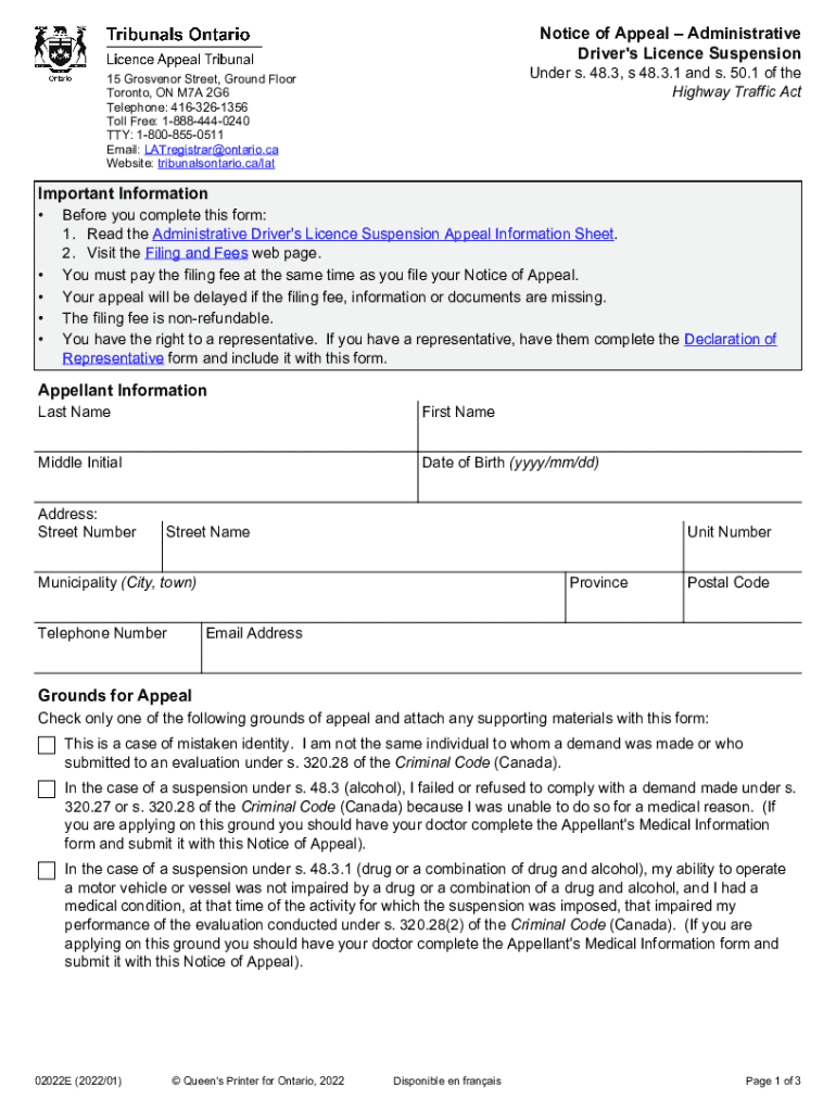 Notice of Appeal Administrative Driver\'s License SuspensionUnder s. 48.3, s 48.3.1 and s. 50.1 of the Highway Traffic Act15 Grosvenor Street, First Floor Toronto, ON M7A 2G6 Telephone: 4163261356