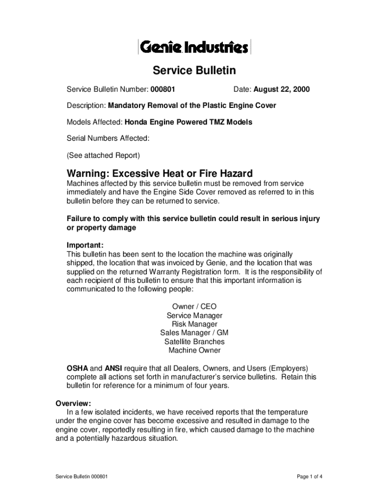 Service Bulletin Service Bulletin Number: 000801Date: August 22, 2000Description: Mandatory Removal of the Plastic Engine Cover Models Affected: Honda Engine Powered TMZ Models Serial Numbers Affected: