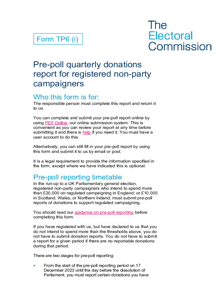 1 Form TP6 (i)Prepoll quarterly donations report for registered nonparty campaigners Who this form is for:The responsible person must complete this report and return it to us. You can complete and