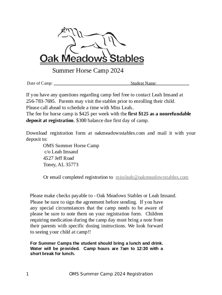 Instructions for the Oak Meadows Stables: Horsemanship Lessons form