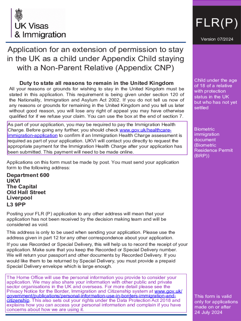 FLR(P) Version 07/2024Application for an extension of permission to stay in the UK as a child under Appendix Child staying with a Godparent Relative (Appendix CNP) duty to state all reasons to remain