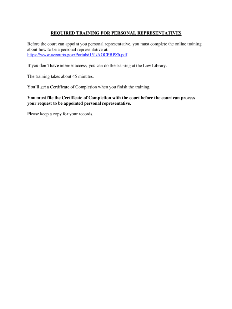 REQUIRED TRAINING FOR PERSONAL REPRESENTATIVES Before the court can appoint you personal representative, you must complete the online training about how to be a personal representative at: https://www.azcourts.gov/Portals/151/AOCPBPZ6.pdf