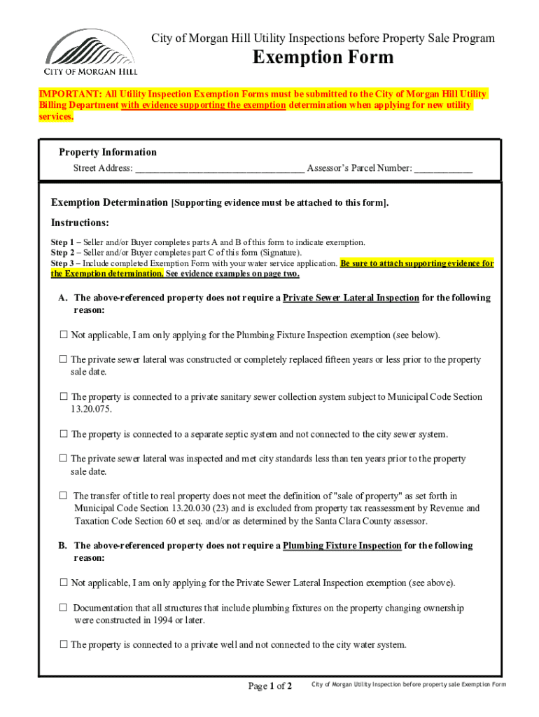 City of Morgan Hill Utility Inspections before Property Sale ProgramExemption FormIMPORTANT: All Utility Inspection Exemption Forms must be submitted to the City of Morgan Hill Utility Billing Department