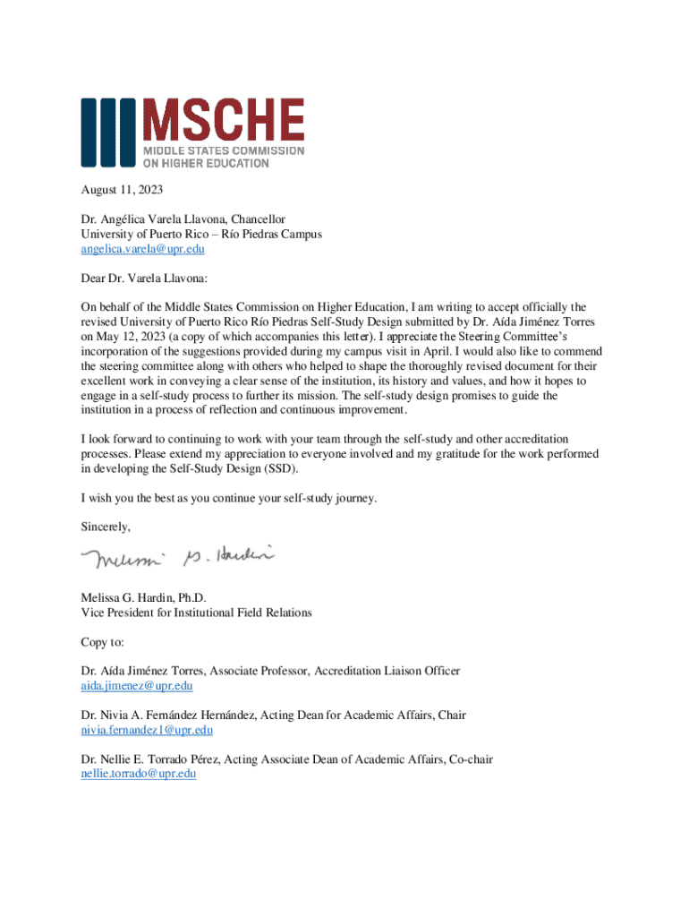 August 11, 2023, Dr. Anglican Varela Leaving, Chancellor University of Puerto Rico RO Piers Campus angelica.varela@upr.edu Dear Dr. Varela Leaving: On behalf of the Middle States Commission on Higher