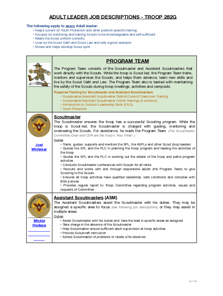 ADULT LEADER JOB DESCRIPTIONS TROOP 282G The following apply to every Adult leader: Keeps current on Youth Protection and other position specific training Focuses on mentoring and training Scouts