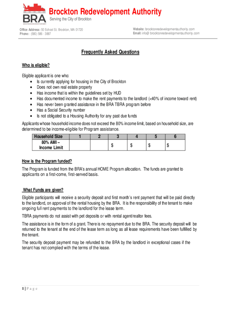 It is an application form used by the Brockton Redevelopment Authority to provide rental assistance to eligible residents who are facing financial difficulties.