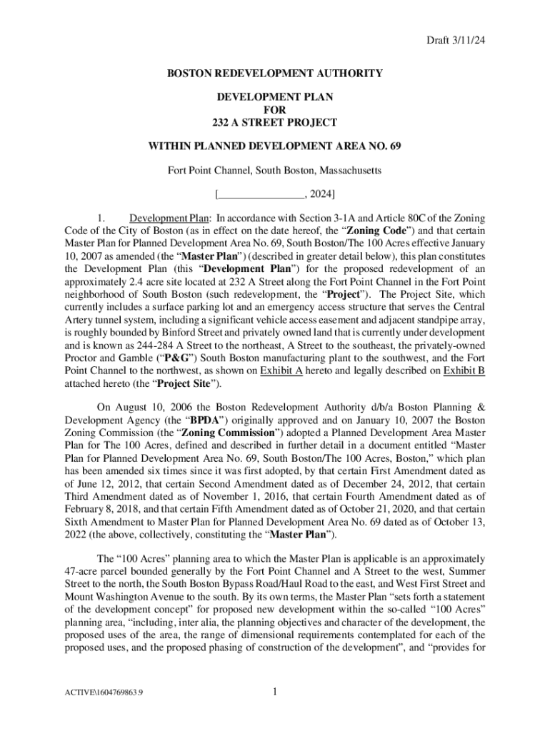 This Development Plan outlines the redevelopment of 232 A Street, South Boston, enhancing public space, urban design, and job creation, while ensuring compliance with environmental standards.