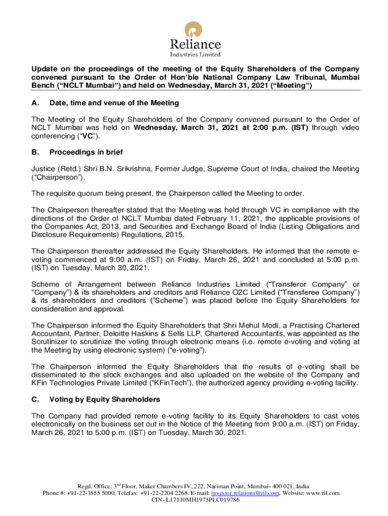 Update on the proceedings of the meeting of the Equity Shareholders of the Company convened pursuant to the Order of Honble National Company Law Tribunal, Mumbai Bench (NCLT Mumbai) and held on Wednesday,