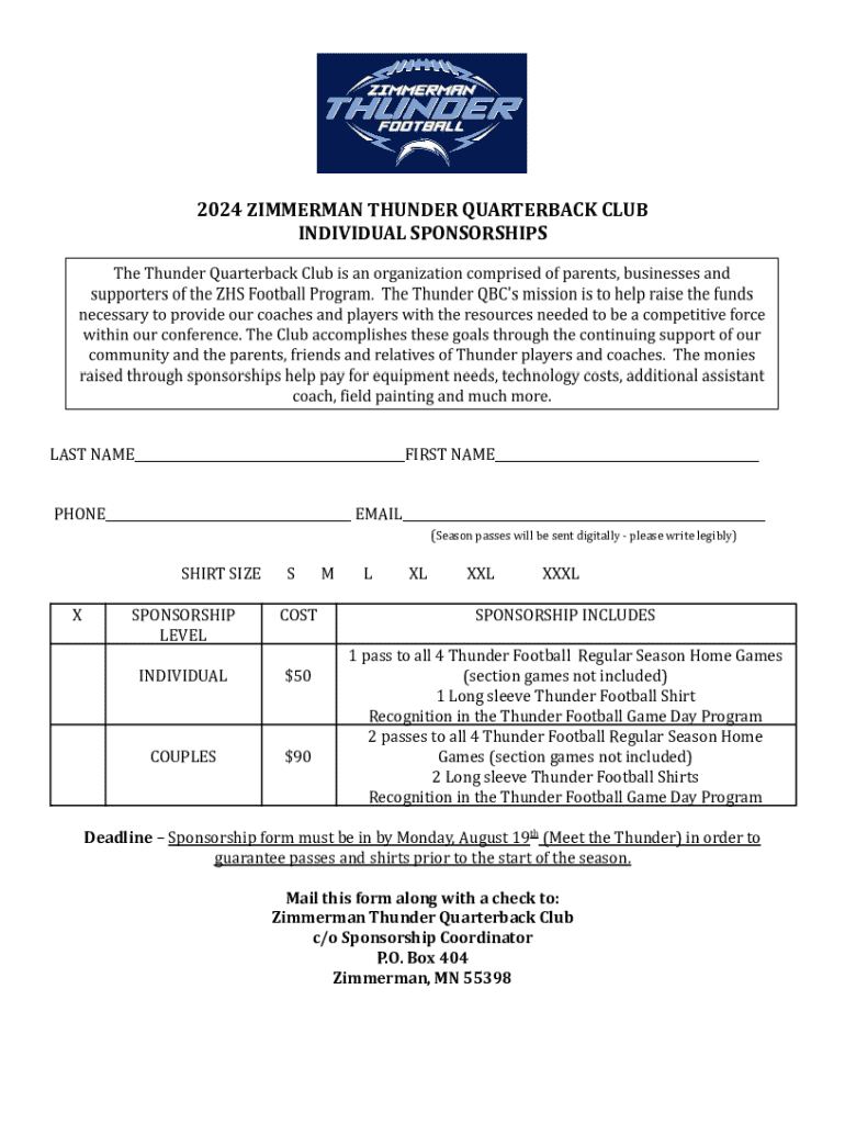 2024 ZIMMERMAN THUNDER QUARTERBACK CLUB INDIVIDUAL SPONSORSHIPSLAST NAME___FIRST NAME___PHONE___ EMAIL___ (Season passes will be sent digitally please write legibly)SHIRT SIZE SPONSORSHIP LEVELS COSTINDIVIDUAL$50COUPLES$90MLXLXXLXXXLSPONSORSHIP