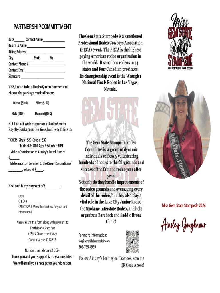 PARTNERSHIP COMMITTMENT Date___ Contact Name___ Business Name ___ Billing Address___ City___ State___ Zip___ Contact Phone #___ Contact Email ___ Signature ___ YES, I wish to be a Rodeo Queen Partner