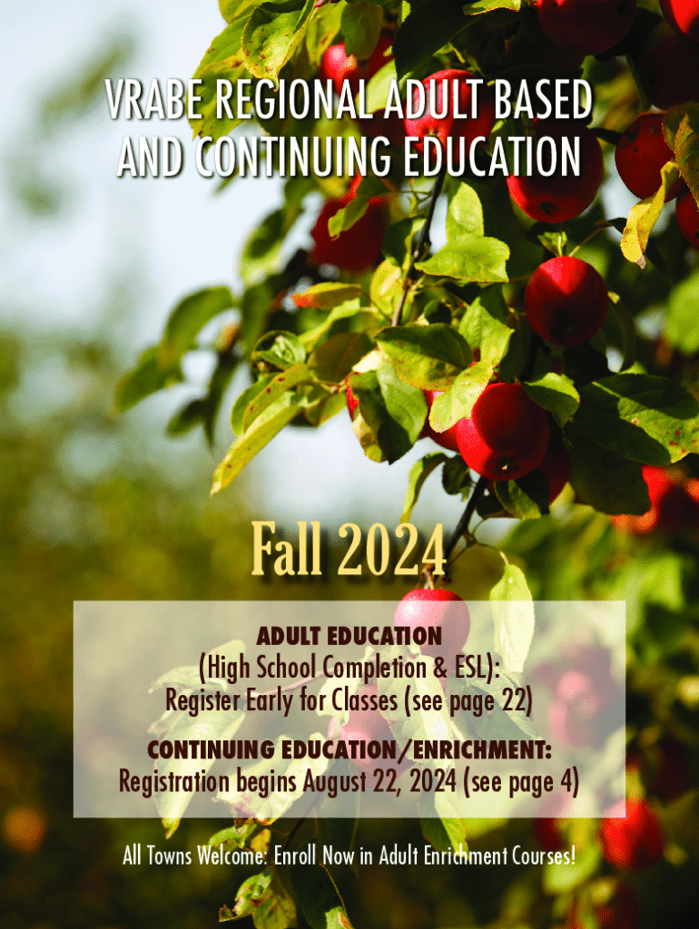 VRABE REGIONAL ADULT BASED AND CONTINUING EDUCATIONFall 2024 ADULT EDUCATION(High School Completion & ESL): Register Early for Classes (see page 22) CONTINUING EDUCATION/ENRICHMENT:Registration begins