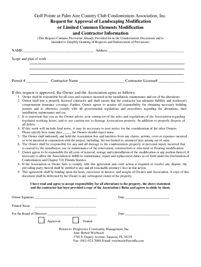 Submit your landscaping modification request for Golf Point eat Palm Are. Ensure compliance with Association rules and contractor responsibilities.