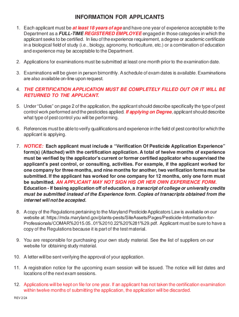 This document provides essential details on the application process for Maryland pesticide applicator certification, including requirements, deadlines, and regulations.
