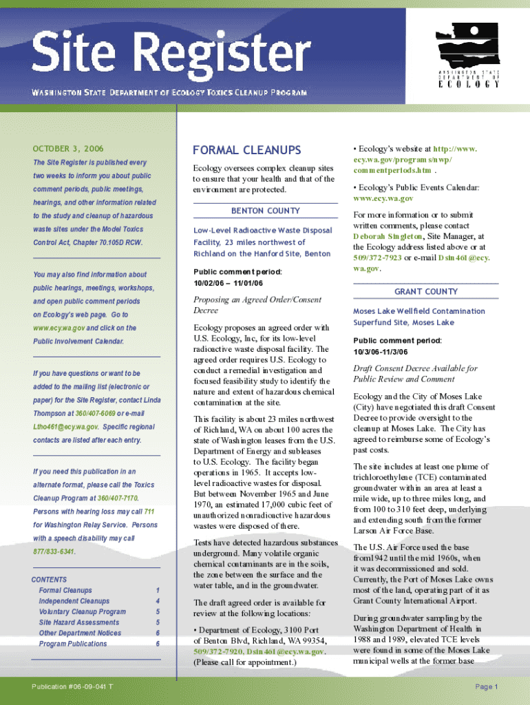 FORMAL CLEANUPSOCTOBER 3, 2006 The Site Register is published everyEcology oversees complex cleanup sites to ensure that your health and that of the environment are protected.two weeks to inform you