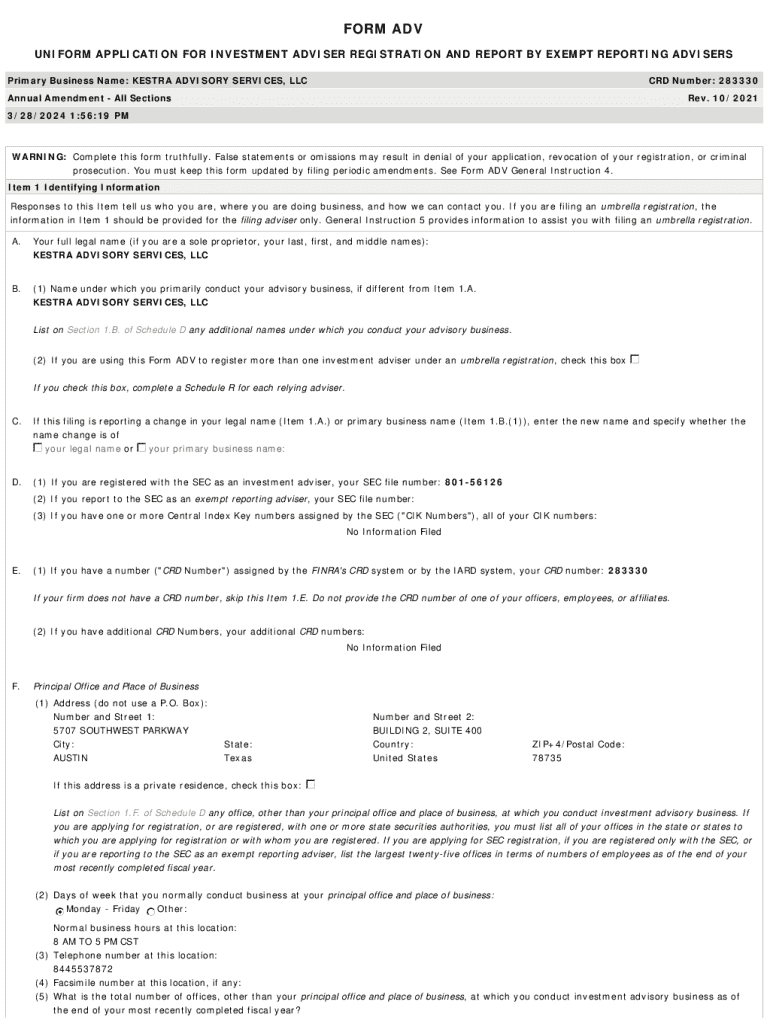 FORM ADV UNIFORM APPLICATION FOR INVESTMENT ADVISER REGISTRATION AND REPORT BY EXEMPT REPORTING ADVISERS Primary Business Name: KESTRA ADVISORY SERVICES, LLCCRD Number: 283330Annual Amendment All SectionsRev. 10/20213/28/2024 1:56:19 PMWARNING: Complete this form truthfully. False statements or omissions may result in denial of your application, revocation of your registration, or criminal prosecution. You must keep this form updated by filing periodic amendments. See Form ADV General...