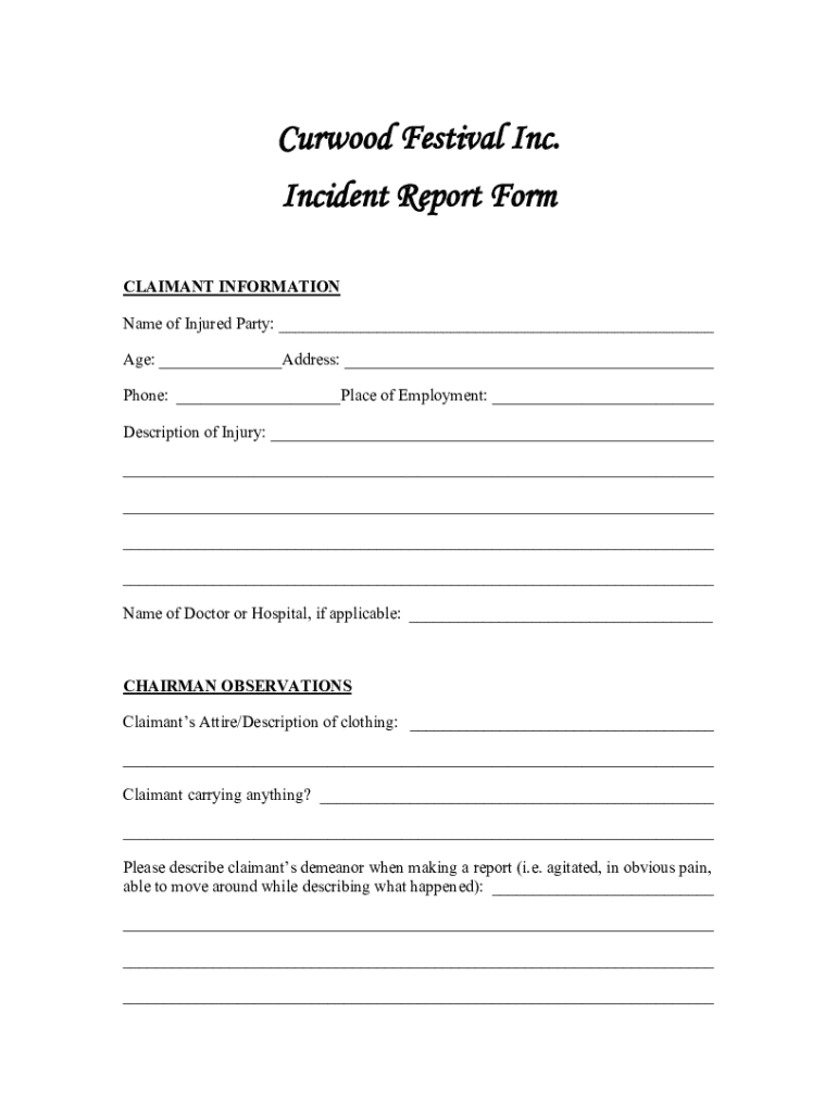 Detailed incident report form for Cur wood Festival to document injuries and related information, helping ensure safety and accountability.