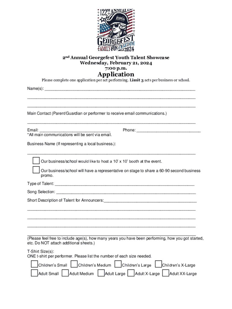 2nd Annual George fest Youth Talent Showcase Wednesday, February 21, 2024 7:00 p.m. Performance Guidelines 1. Open to all area youth ages 17 and under. 2. We recognize this is an excellent opportunity