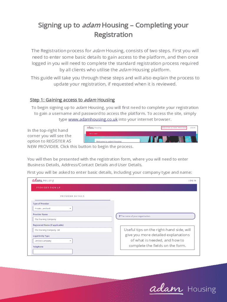 Learn how to register on the adam Housing platform, including steps to complete your registration and update your details. A comprehensive guide for new providers.