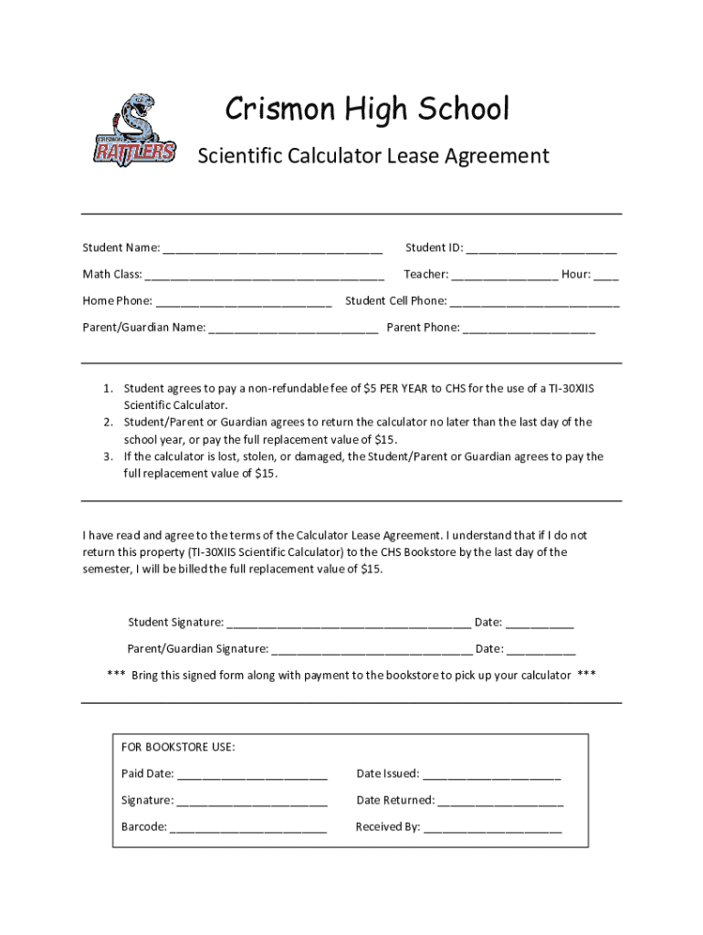 Lease agreement for TI-30XIIS Scientific Calculator at Crimson High School, outlining fees, return policy, and replacement costs for students.